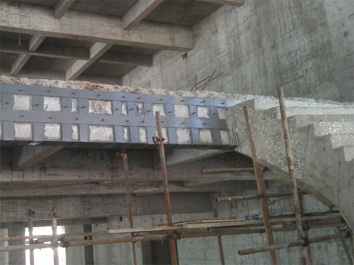 業主對前期已施工完工的砼樓梯、電動扶梯預留位置改變,經雙方技術交流商定,業主將該加固工程直接發包給我公司。加固方式有: 結構梁粘帖鋼板加固、新增加電梯梁植筋加固、新增加電梯井機坑大面積植筋、新增樓板大面積植筋。本工程2013年9月25日已竣工驗收合格并投入使用。